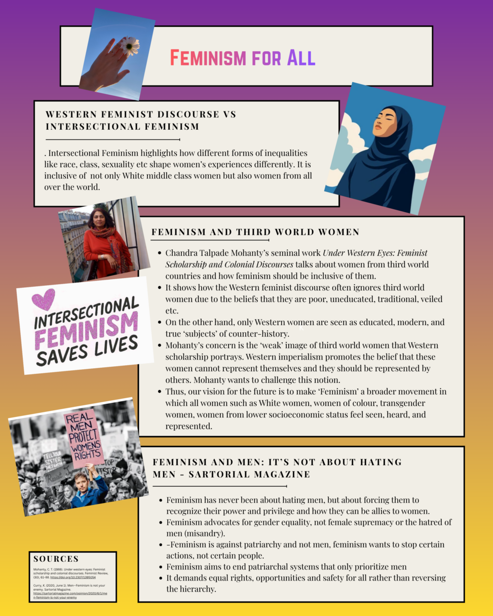 This poster illustrates women from third world countries who are often ignored. The goal of this poster is to make women from all backgrounds feel seen, heard, and valued. I introduce the fresh ideas of feminist theorist Chandra Talpade Mohanty’s book Under Western Eyes: Feminist Scholarship and Colonial Discourses. Feel free to give it a read! As a Man, you are welcome into the inclusive feminism as well. Here is a Magazine I found for you: https://sartorialmagazine.com/opinion/2020/6/1/men-feminism-is-not-your-enemy